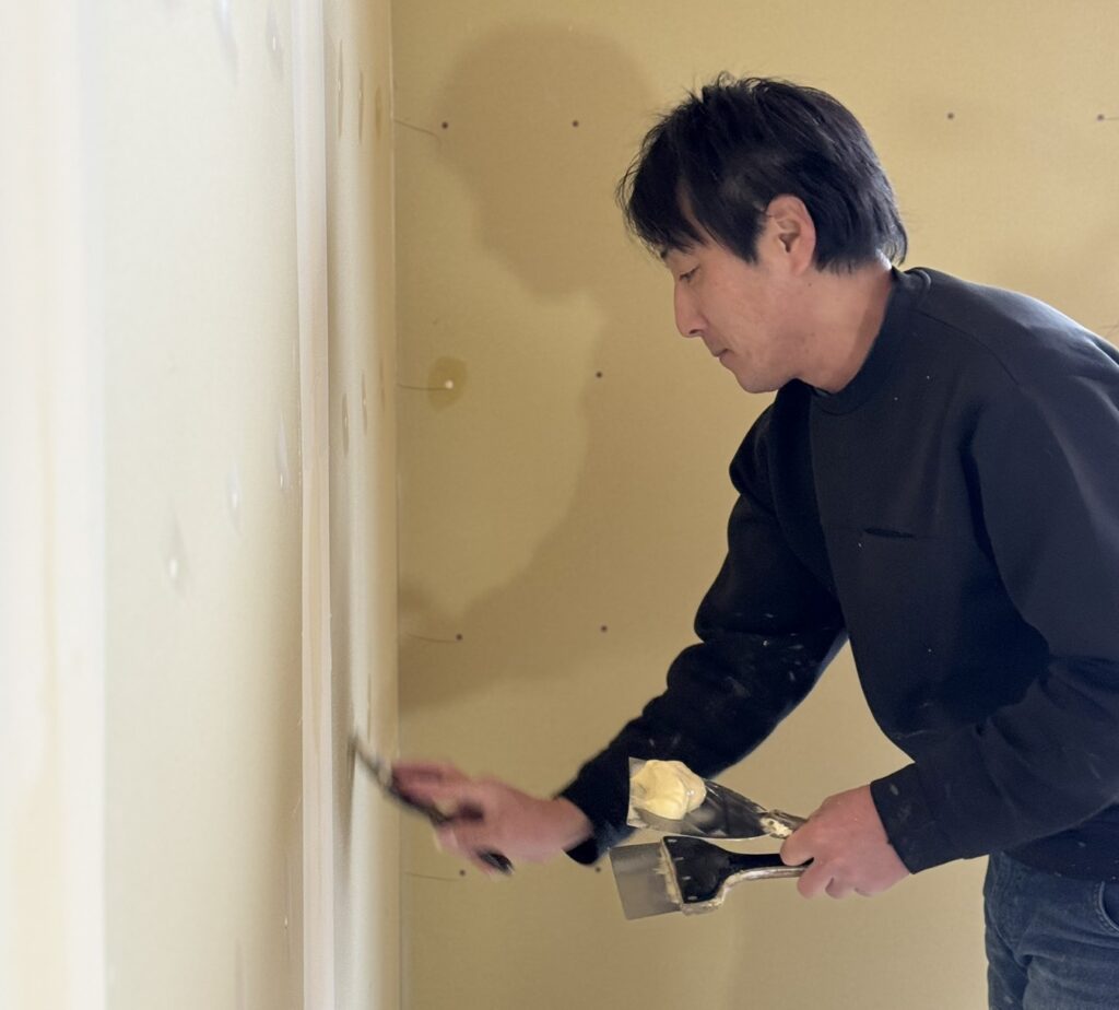 写真は、内装工事を担当してくれている 内装職人の小島さん が、壁の下地処理をしているところ。